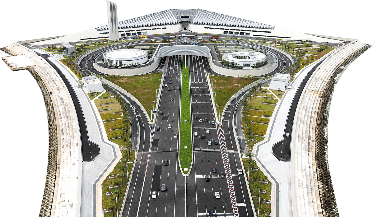 Vehicles are seen entering and exiting the immersed tunnel on the west artificial island of the Shenzhen-Zhongshan Link. (ZHONG ZHIHUI/NANFANG DAILY)