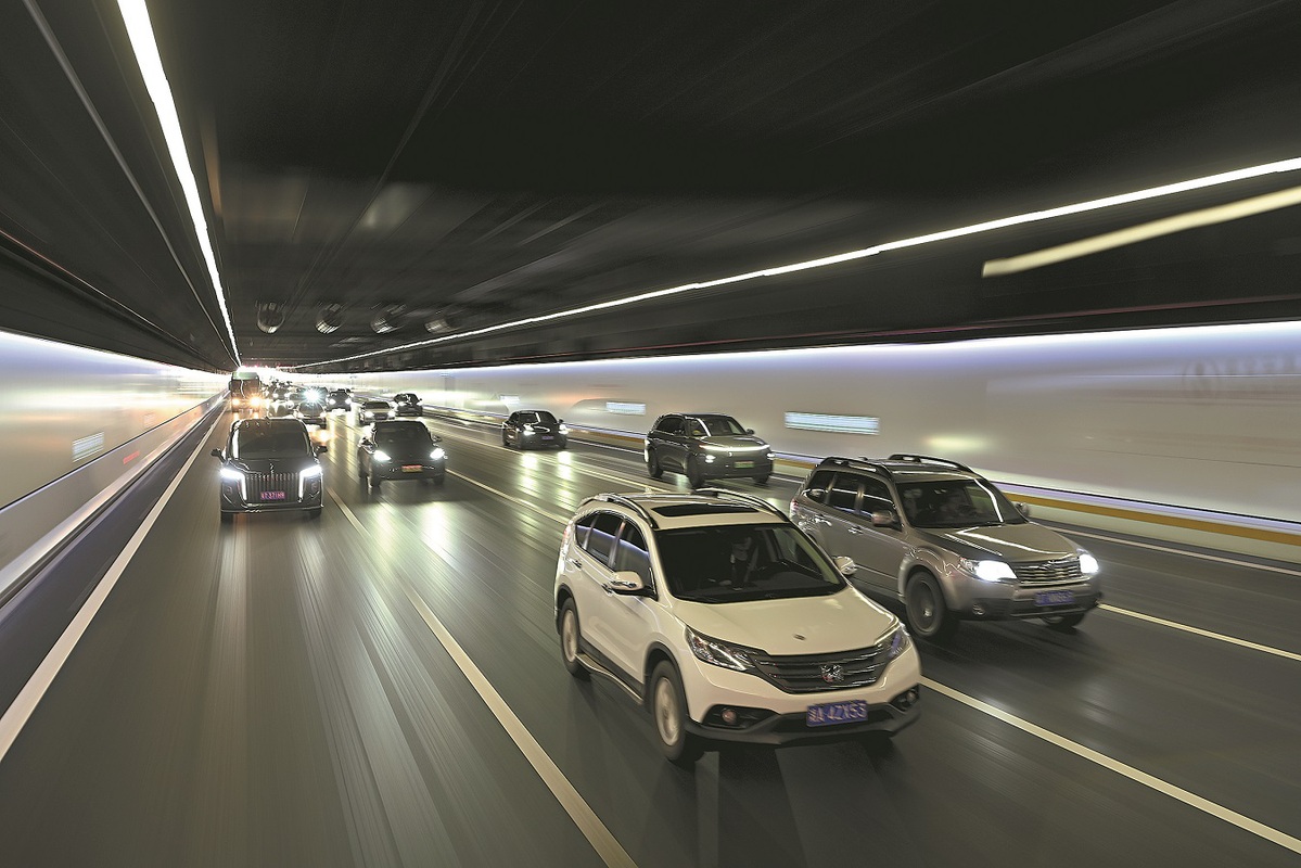 Vehicles travel in the undersea tunnel of the Shenzhen-Zhongshan Link in Guangdong province. (CHEN JIMIN/CHINA NEWS SERVICE)