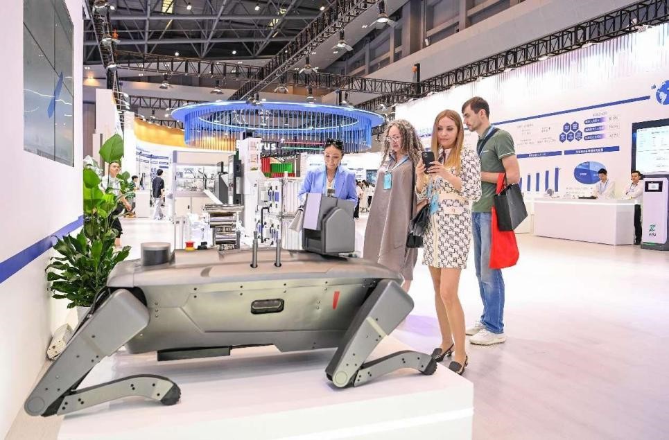 The 6th Western China International Fair for Investment and Trade kicked off on May 23, 2024 in southwest China's Chongqing municipality. Photo shows foreign visitors looking at an explosion-proof four-legged robot at an exhibition stand. (People's Daily Online/Wang Jiaxi)