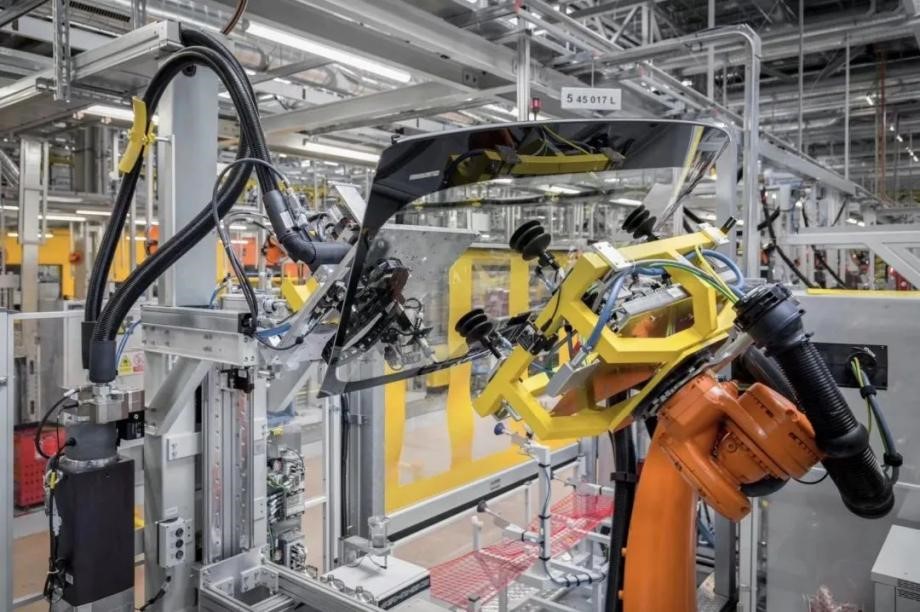 A robot applies adhesive to a windshield in the production base of BMW Brilliance Automotive Ltd. (BBA) in Shenyang, capital of northeast China's Liaoning province. (Photo provided by BMW Brilliance Automotive Ltd.)