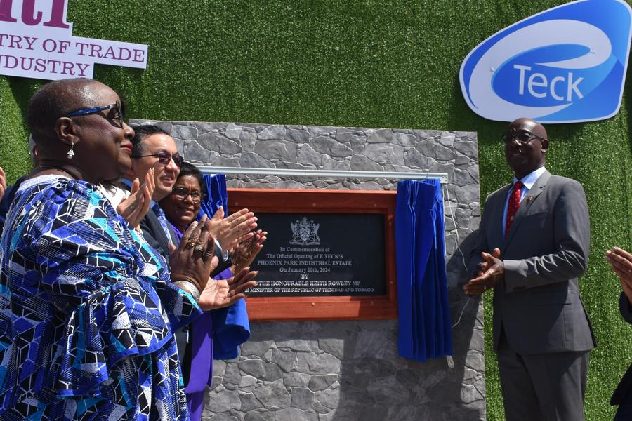 Trinidad and Tobago's Prime Minister Keith Rowley (1st R), Minister of Trade and Industry Paula Gopee-Scoon (3rd L), Chinese Ambassador to Trinidad and Tobago Fang Qiu (2nd L) and other officials attend the launch ceremony of the Phoenix Park Industrial Estate in Point Lisas, the second-largest port in Trinidad and Tobago, Jan. 10, 2024. (Xinhua/Zhu Wanjun)