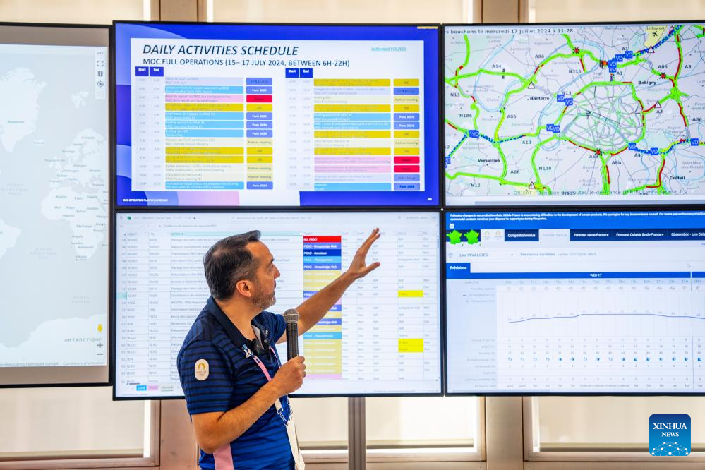A staff member gives an introduction to media workers at MOC (Main Operation Center) in the office building of Paris 2024 organizing committee in Paris, France on July 17, 2024. (Xinhua/Sun Fei)