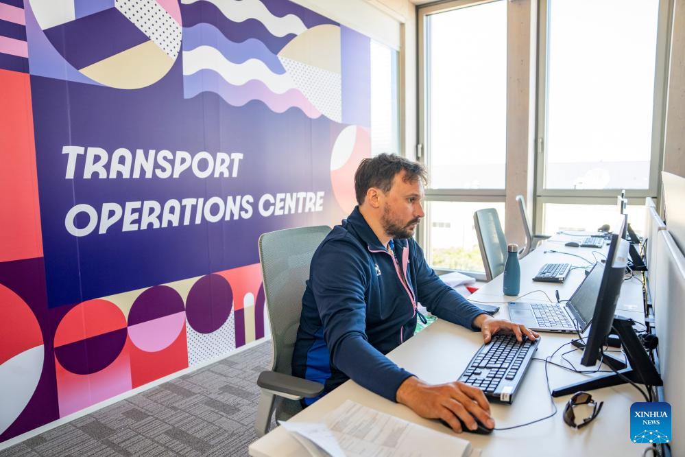 A staff member works at the transport operation center in MOC (Main Operation Center) in the office building of Paris 2024 organizing committee in Paris, France on July 17, 2024. (Xinhua/Sun Fei)
