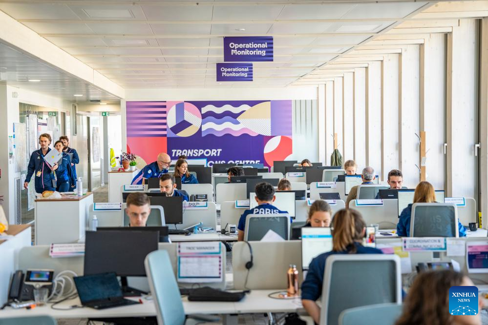 Staff work at the transport operation center in MOC (Main Operation Center) in the office building of Paris 2024 organizing committee in Paris, France on July 17, 2024. (Xinhua/Sun Fei)