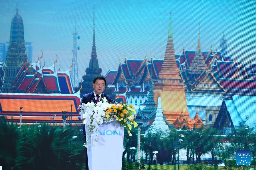 Zeng Qinghong, chairman of GAC Group, addresses the inauguration ceremony of the electric vehicle (EV) factory of China's carmaker GAC Aion in Rayong province, Thailand on July 17, 2024. (Xinhua/Sun Weitong)