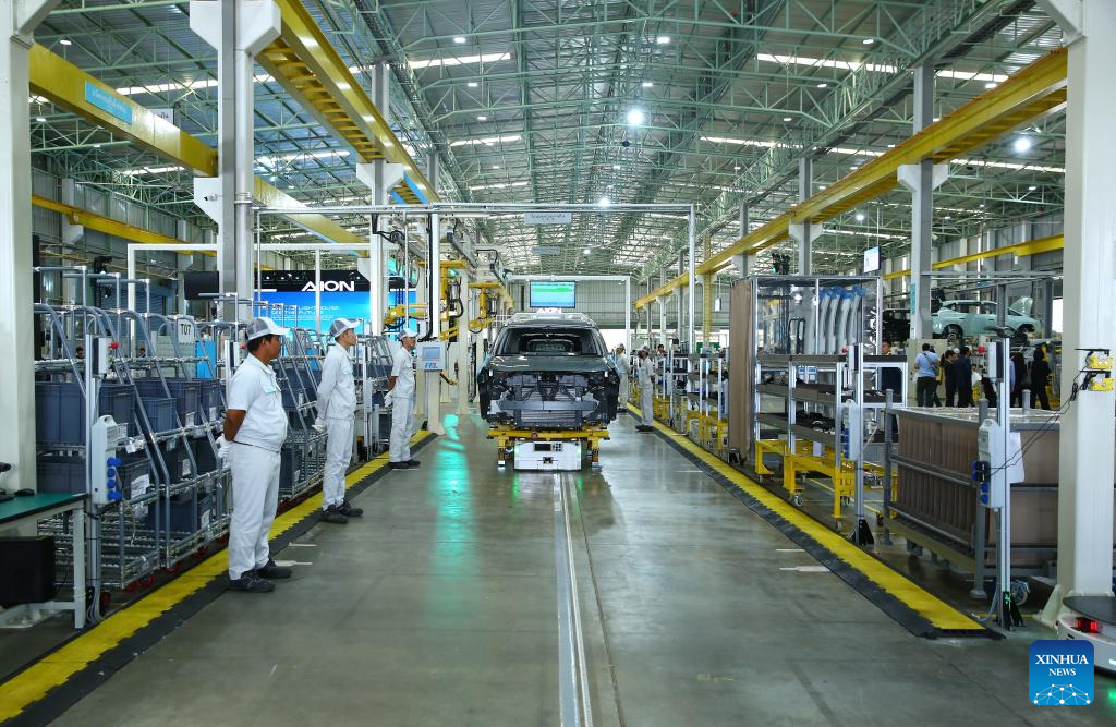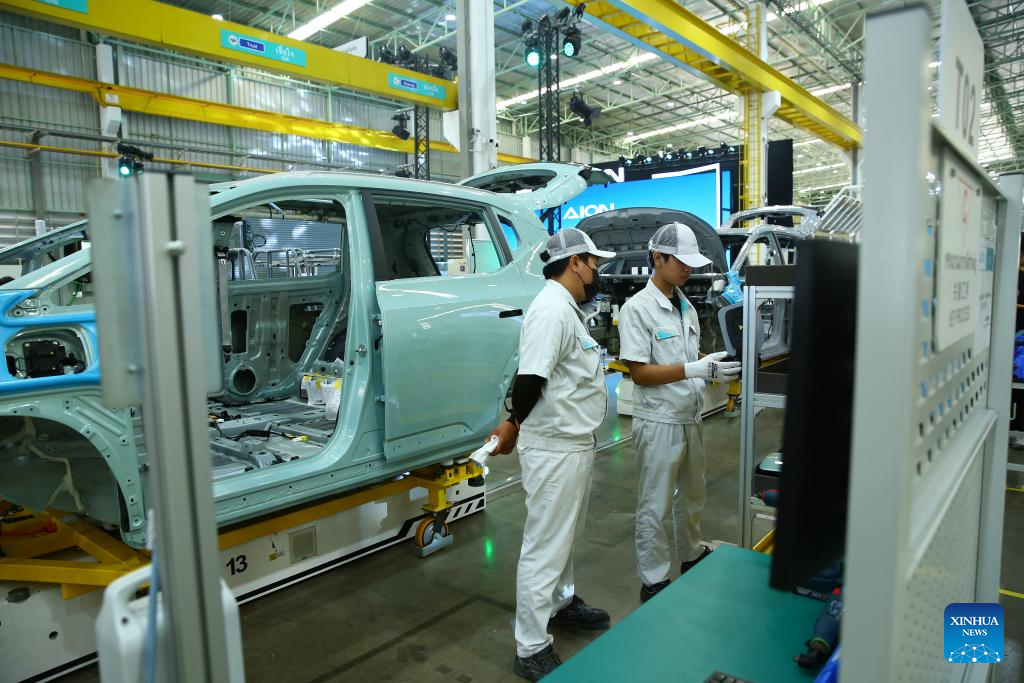 Staff members work at the electric vehicle (EV) factory of China's carmaker GAC Aion in Rayong province, Thailand on July 17, 2024. (Xinhua/Sun Weitong)