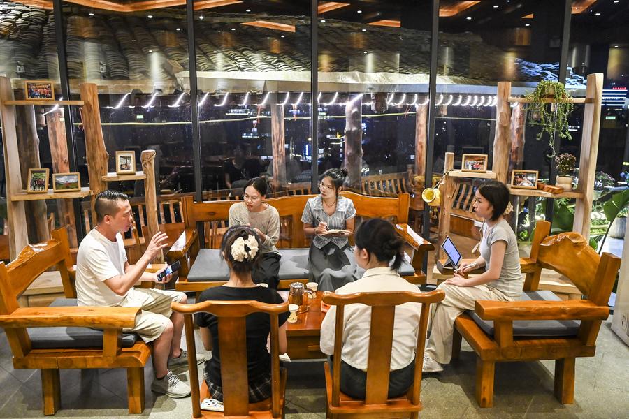 Yu Qiongtong (1st L), a homestay operator, talks with newly-recruited staff members at his homestay at Dazhai Village of Longsheng County, south China's Guangxi Zhuang Autonomous Region, July 10, 2024. (Xinhua/Cao Yiming)