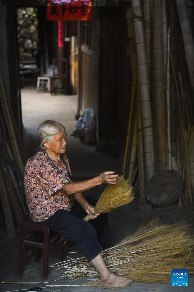 Resident Ye Jinjuan makes a broom at home in Songzhuang Village of Songyang County, east China's Zhejiang Province, July 17, 2024. Nestled in the mountains, Songzhuang Village of Songyang County boasts a history of over 600 years and preserves many traditional residences. In recent years, local government has renovated old houses and ancient paths and introduced new business forms to attract young talents to start their businesses there. (Xinhua/Weng Xinyang)