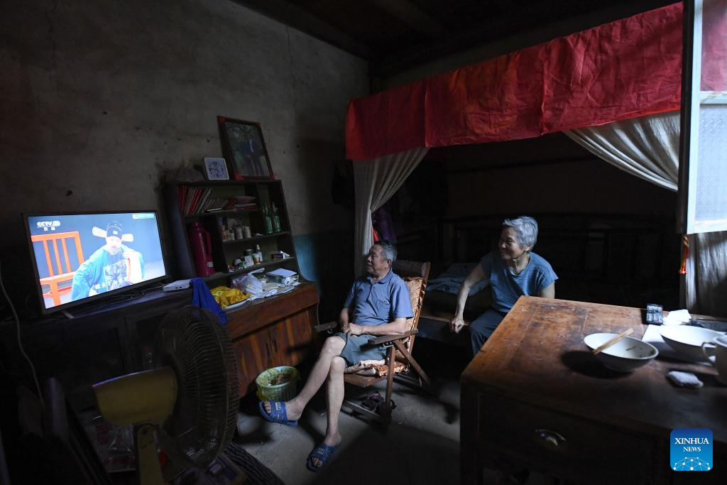 Residents Ye Gaoshui and Ye Mingxiu watch a performance of Huangmei opera on TV at home in Songzhuang Village of Songyang County, east China's Zhejiang Province, July 17, 2024. Nestled in the mountains, Songzhuang Village of Songyang County boasts a history of over 600 years and preserves many traditional residences. In recent years, local government has renovated old houses and ancient paths and introduced new business forms to attract young talents to start their businesses there. (Xinhua/Weng Xinyang)