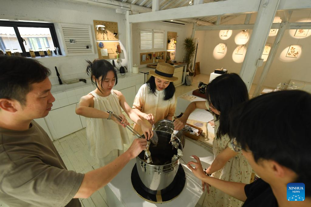 Hu Juan (C), a young maker from central China's Hunan Province, dyes cloths with her students in Songzhuang Village of Songyang County, east China's Zhejiang Province, July 18, 2024. Nestled in the mountains, Songzhuang Village of Songyang County boasts a history of over 600 years and preserves many traditional residences. In recent years, local government has renovated old houses and ancient paths and introduced new business forms to attract young talents to start their businesses there. (Xinhua/Weng Xinyang)