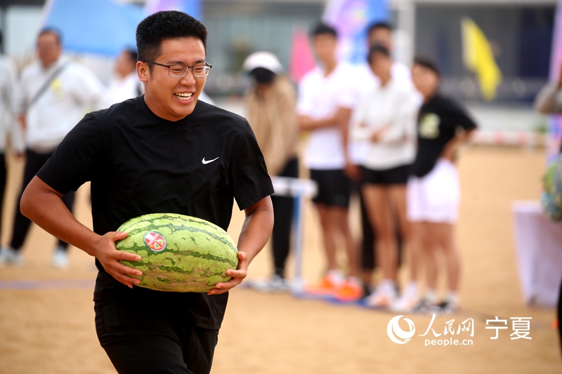 A contestant competes in a watermelon harvest event during the desert sports contest at Shapotou scenic spot in Zhongwei city, northwest China's Ningxia Hui Autonomous Region. (People's Daily Online/Yan Mengjie)