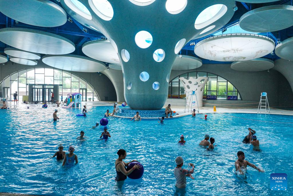 A drone photo taken on July 19, 2024 shows children playing in a swimming pool in Rongcheng City, east China's Shandong Province. (Photo by Li Xinjun/Xinhua)