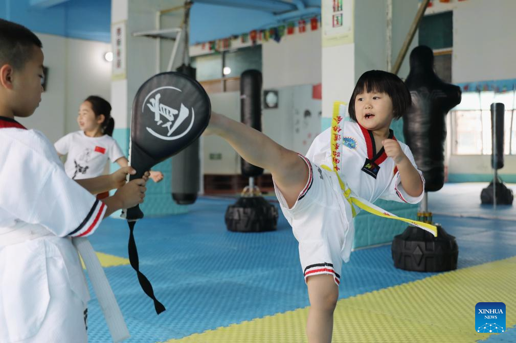 Children practice taekwondo at a training center in Shibing County, Qiandongnan Miao and Dong Autonomous Prefecture, southwest China's Guizhou Province, July 19, 2024. (Photo by Tai Shengzhi/Xinhua)