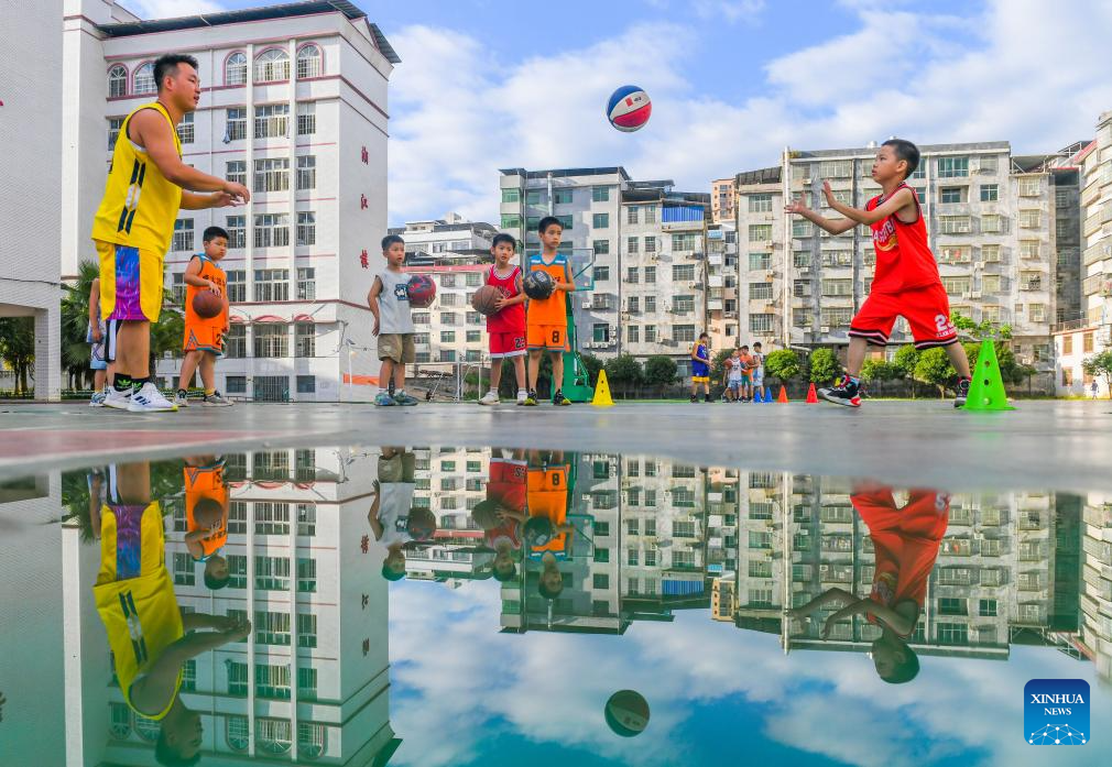 Kids practice basketball at a school in Daoxian County of Yongzhou City, central China's Hunan Province, July 19, 2024. (Photo by Jiang Keqing/Xinhua)