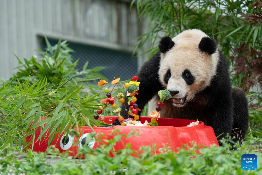 Giant panda Pan Yue enjoys a birthday treat at the Shenshuping giant panda base of Wolong National Nature Reserve in southwest China's Sichuan Province, July 19, 2024. A special event was held to celebrate the birthdays of giant pandas here on Friday. Carrots, watermelons and other food were prepared for them as the birthday treat. (Xinhua/Yu Li)
