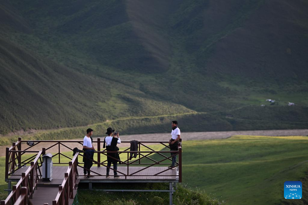 Tourists enjoy the scenery at a bend along the Yellow River in Mentang Township of Jiuzhi County, Golog Tibetan Autonomous Prefecture, northwest China's Qinghai Province, July 19, 2024. (Xinhua/Zhang Long)