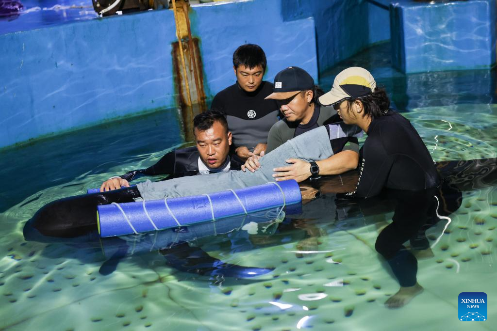 Volunteers help a short-finned pilot whale adapt to floats attached to her body at Sanya Haichang Animal Conservation Center in Sanya, south China's Hainan Province, July 20, 2024. (Xinhua/Zhang Liyun)