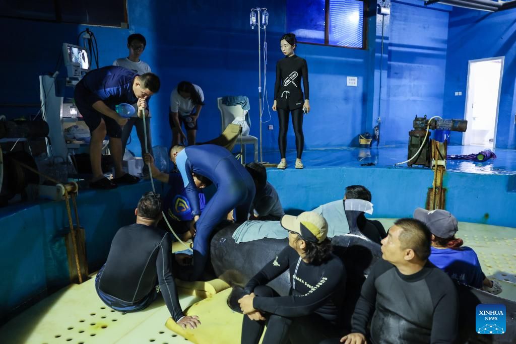 A veterinarian (1st L) dredges the stomach tube for a short-finned pilot whale at Sanya Haichang Animal Conservation Center in Sanya, south China's Hainan Province, July 20, 2024. (Xinhua/Zhang Liyun)