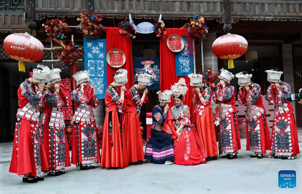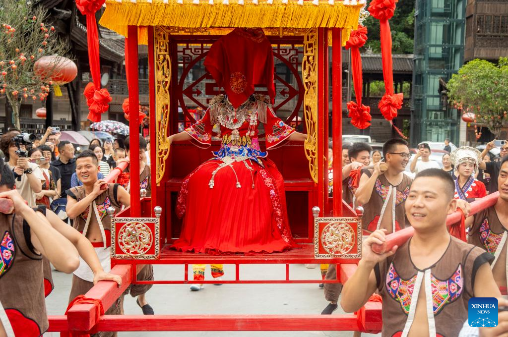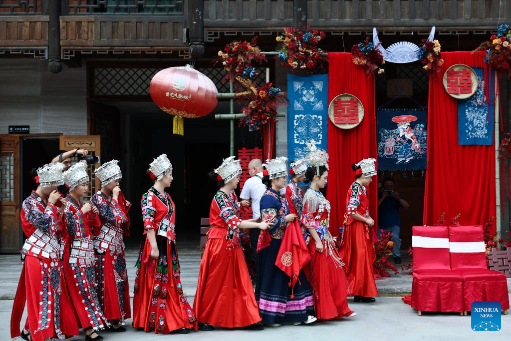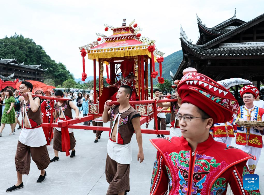 A wedding with Miao ethnic group features is pictured at Chiyou Jiuli Town scenic spot of Pengshui Miao-Tujia Autonomous County, southwest China's Chongqing, July 20, 2024. Local authorities of Pengshui Miao-Tujia Autonomous County has taken advantages of ethnic features to promote its summer tourism. (Photo by Li Xiaoguo/Xinhua)