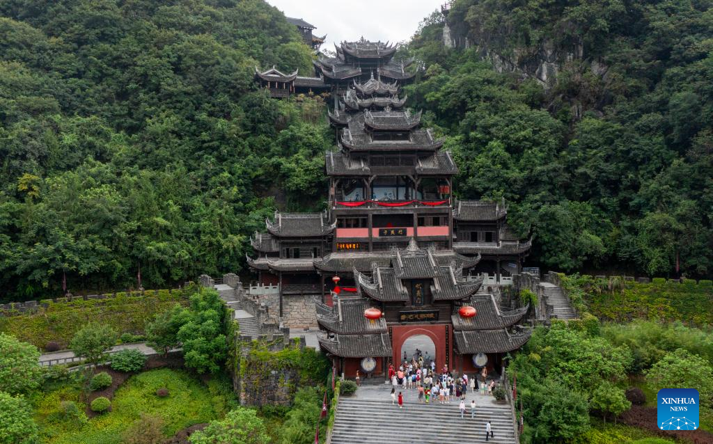 This aerial photo taken on July 20, 2024 shows tourists visiting Chiyou Jiuli Town scenic spot of Pengshui Miao-Tujia Autonomous County, southwest China's Chongqing. Local authorities of Pengshui Miao-Tujia Autonomous County has taken advantages of ethnic features to promote its summer tourism. (Xinhua/Liu Chan)