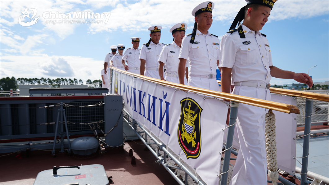 Chinese sailors board the Russian naval corvette Gromkiy for a visit during the China-Russia joint naval exercise coded Exercise Joint Sea-2024 on July 13, 2024. (eng.chinamil.com.cn/Photo by Luan Cheng)