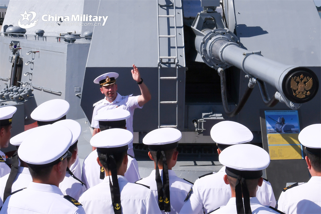 A Russian naval officer introduces the Russian naval corvette Gromkiy to visiting Chinese sailors during the China-Russia joint naval exercise coded Exercise Joint Sea-2024 on July 13, 2024. (eng.chinamil.com.cn/Photo by Luan Cheng)