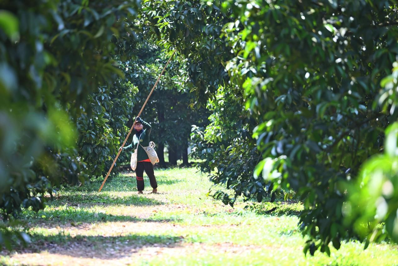A worker picks mangosteens with a long pole. (People's Daily/Bai Yuanqi)