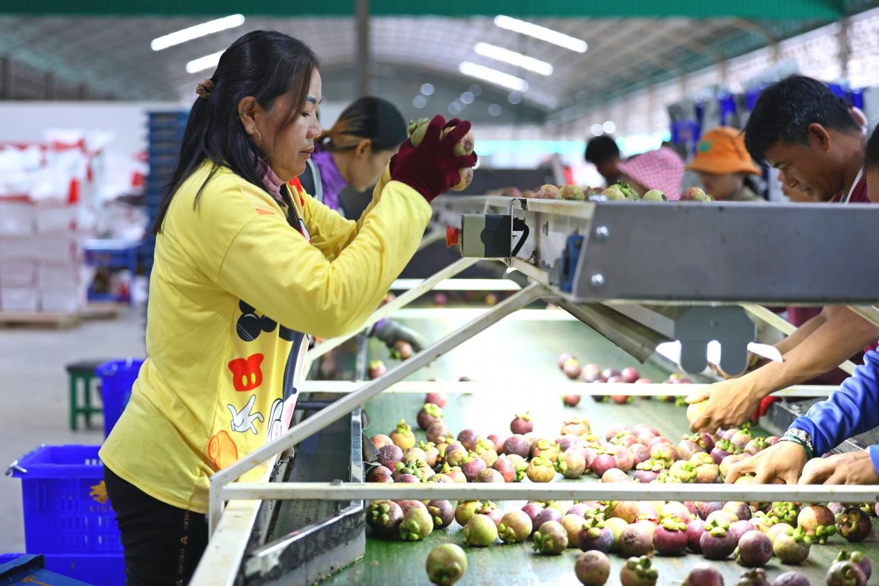 Workers check every mangosteen carefully and sort them according to size and ripeness. (People's Daily/Bai Yuanqi)