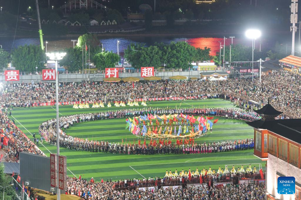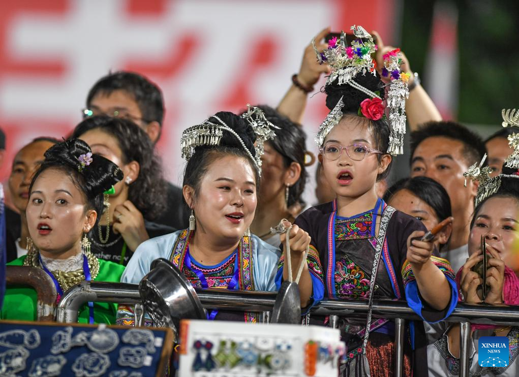 Photo taken on July 20, 2024 shows a "village gala" after the final match between Dangxiang Village and Dongmen Village at the Village Super League in Rongjiang County of southwest China's Guizhou Province. (Xinhua/Yang Wenbin)