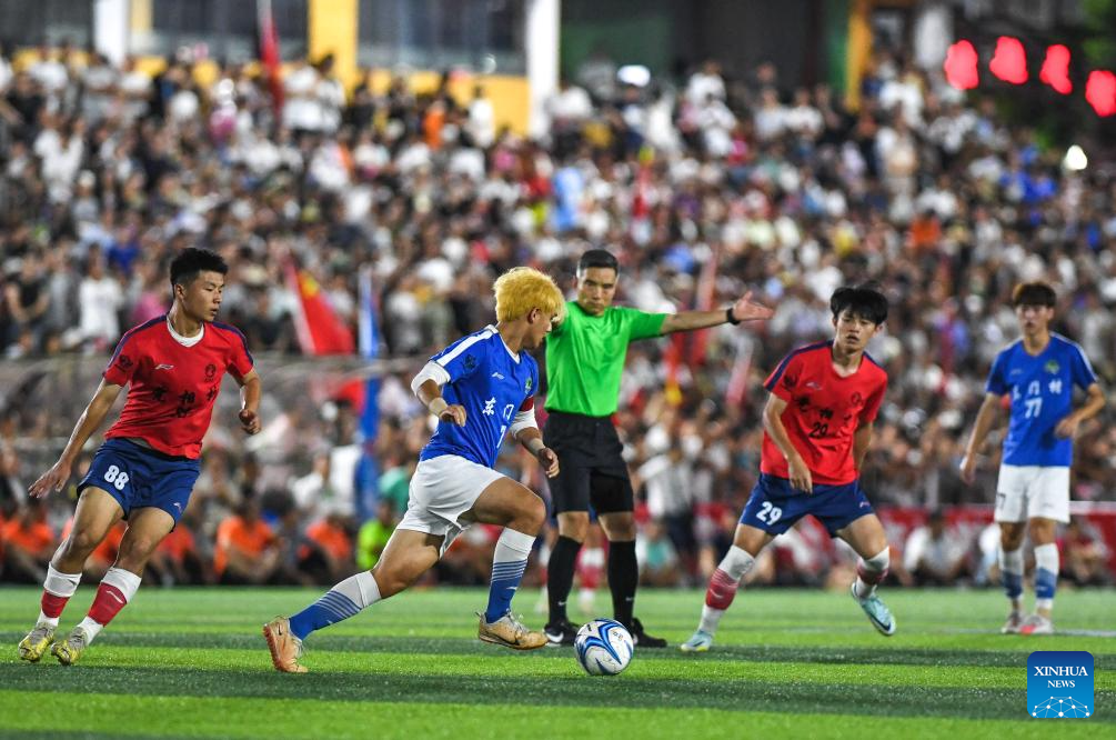 Chen Junpeng (2nd L) of Dongmen Village competes during the final match between Dangxiang Village and Dongmen Village at the Village Super League in Rongjiang County of southwest China's Guizhou Province, July 20, 2024. (Xinhua/Yang Wenbin)