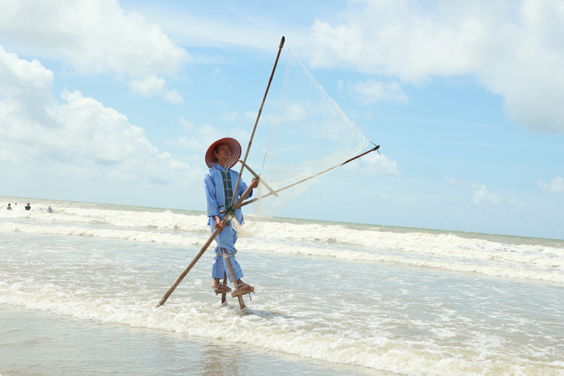 A performer of the Jing ethnic group demonstrates a traditional fishing activity during the Ha Festival in Wanwei village, Jiangping township, Dongxing city, south China's Guangxi Zhuang Autonomous Region. (Photo/Fang Ping)