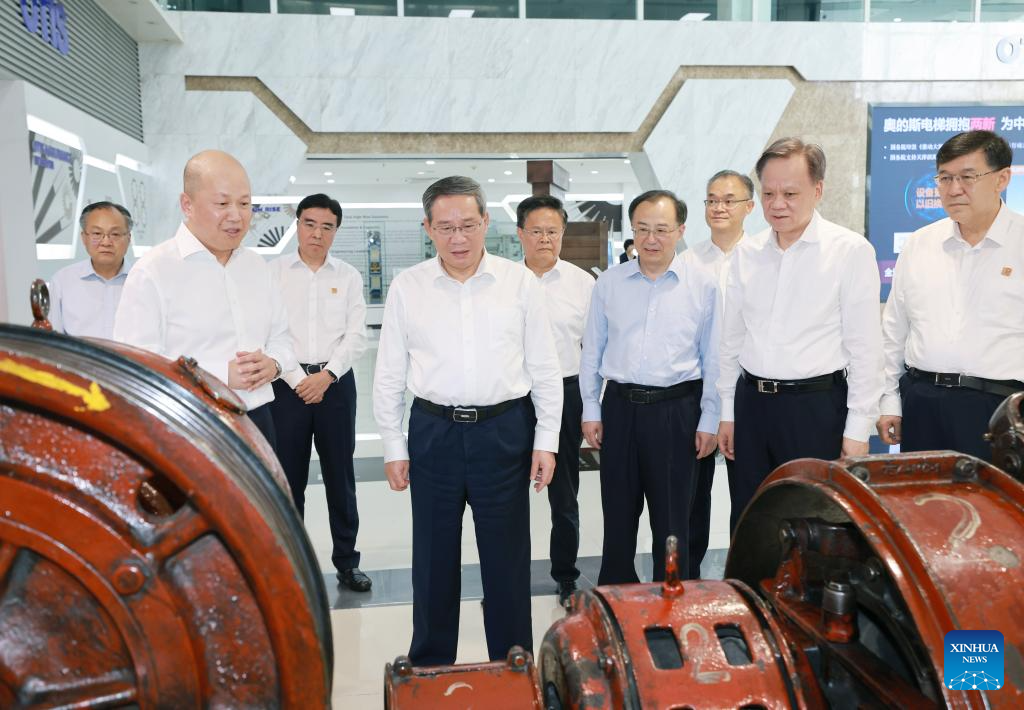 Chinese Premier Li Qiang, also a member of the Standing Committee of the Political Bureau of the Communist Party of China Central Committee, inspects an elevator manufacturer in the Tianjin Binhai New Area in north China's Tianjin Municipality, July 22, 2024. Li made an inspection tour in Tianjin on Monday. (Xinhua/Wang Ye)