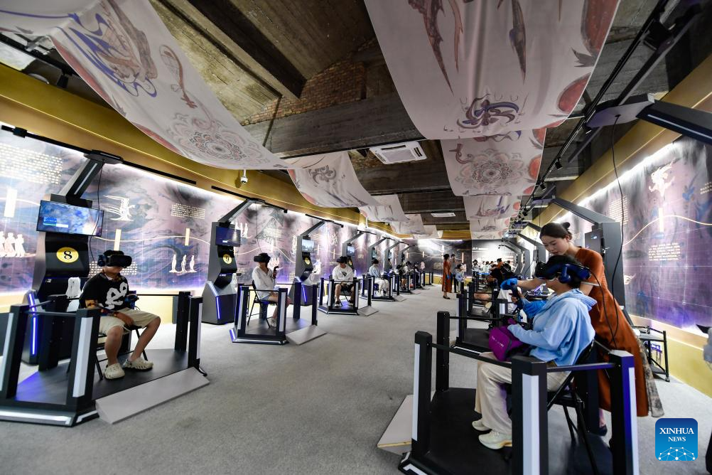 Visitors use virtual reality (VR) equipment to visit the Mogao Grottoes in Dunhuang, northwest China's Gansu Province, July 22, 2024. (Xinhua/Lang Bingbing)