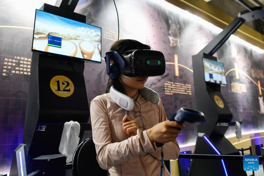 A visitor uses virtual reality (VR) equipment to visit the Mogao Grottoes in Dunhuang, northwest China's Gansu Province, July 22, 2024. (Xinhua/Lang Bingbing)