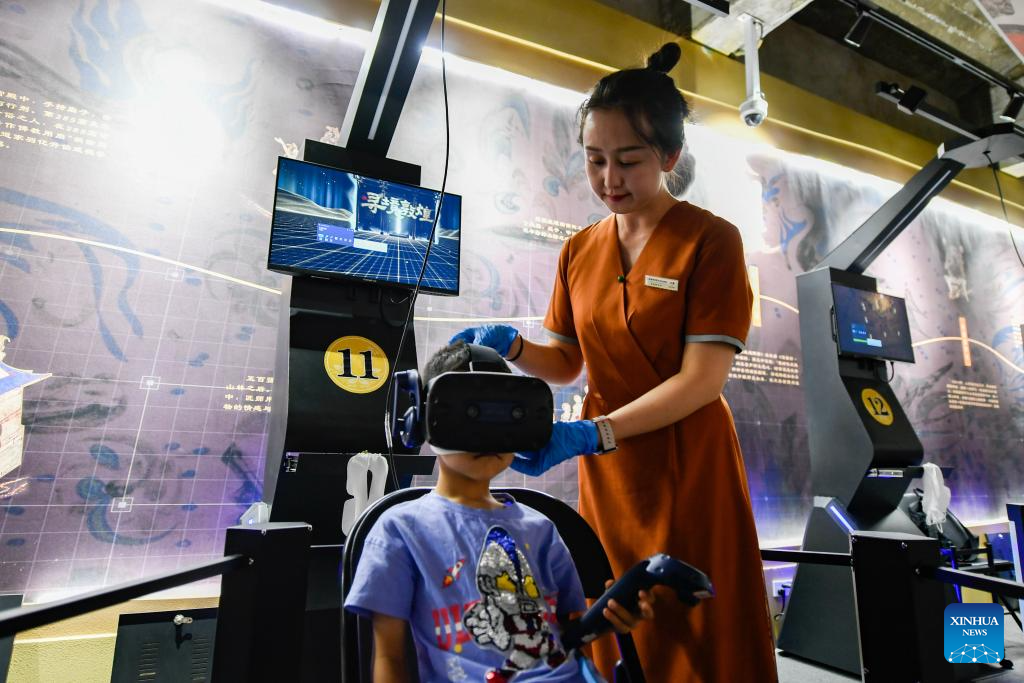 A staff member helps a boy use virtual reality (VR) equipment to visit the Mogao Grottoes in Dunhuang, northwest China's Gansu Province, July 22, 2024. (Xinhua/Lang Bingbing)