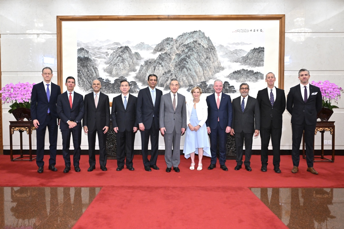 Foreign Minister Wang Yi (center) poses for a group photo in Beijing on Monday with a delegation from the board of directors of the US-China Business Council. (YUE YUEWEI/XINHUA)