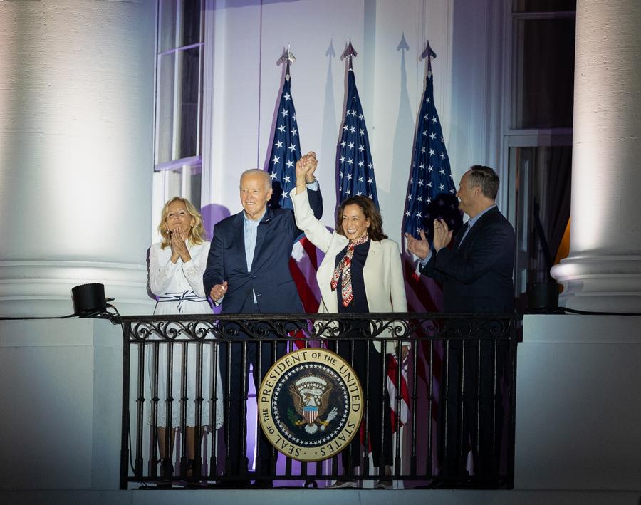 U.S. President Joe Biden and U.S. Vice President Kamala Harris watch the Independence Day fireworks display at the White House in Washington, D.C., the United States, July 4, 2024. (Xinhua/Hu Yousong)