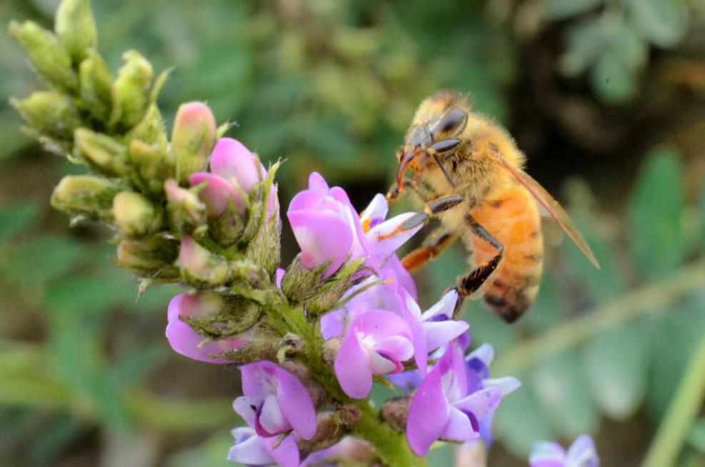 A honey bee sucks nectar from a flower of Astragalus tibeticola Podlech at a bee farm in Shannan city, southwest China's Xizang Autonomous Region. (Photo courtesy of the interviewee)