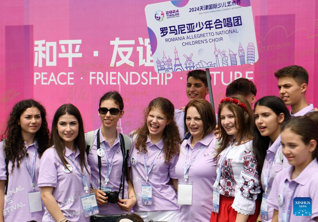 Members from a chorus of Romania pose for a group photo during the 2024 Tianjin International Children's Art Festival in Tianjin, north China, July 22, 2024. The art festival, with the participation of children's art troupe from more than 20 countries and regions, will last until July 26. (Xinhua/Zhao Zishuo)