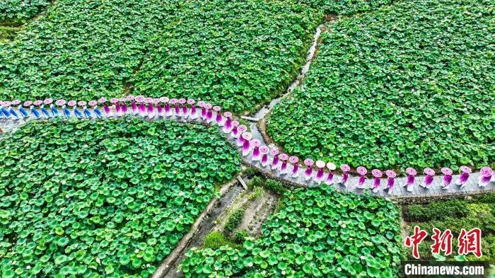 Aerial picture shows tourists going sightseeing at a lotus pond in Guangchang county, east China's Jiangxi Province. (Photo/Liu Lixin)