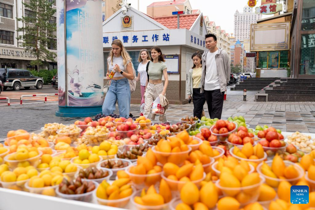 Travelers walk past a fruit stand in Manzhouli, north China's Inner Mongolia Autonomous Region, July 17, 2024. With easier entry policies, including a 144-hour visa-free transit policy that expanded to 37 entry ports as of July 15 and pilot visa-free policies for some countries, "on-a-whim travel" to China is becoming a reality. (Xinhua/Cai Yang)