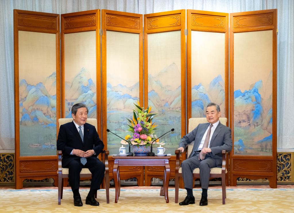 Wang Yi, a member of the Political Bureau of the Communist Party of China (CPC) Central Committee and director of the Office of the Foreign Affairs Commission of the CPC Central Committee, meets with Hiroshi Moriyama, chief of the general council of Japanese Liberal Democratic Party (LDP), in Beijing, capital of China, July 23, 2024. (Xinhua/Zhai Jianlan)