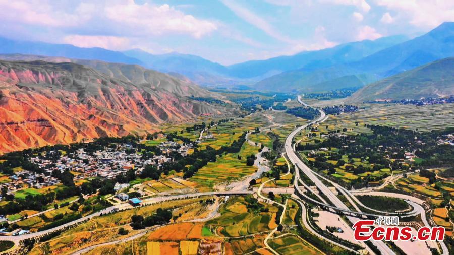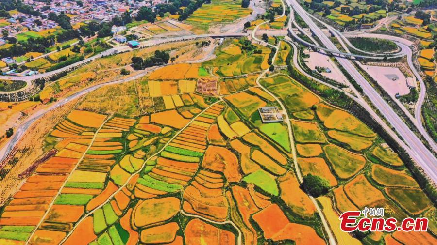 Colorful terraced fields lie on both sides of a highway in Xunhua Sala Autonomous County, northwest China's Qinghai Province. (Photo: China News Service/Ma Long)
