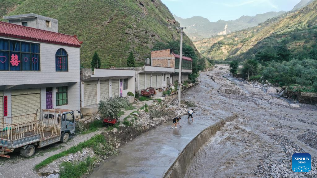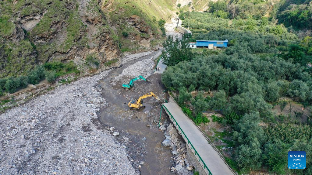 An aerial drone photo taken on July 25, 2024 shows villagers clearing a road at Waina Village of Wudu District in Longnan City, northwest China's Gansu Province.?(Xinhua/Lang Bingbing)