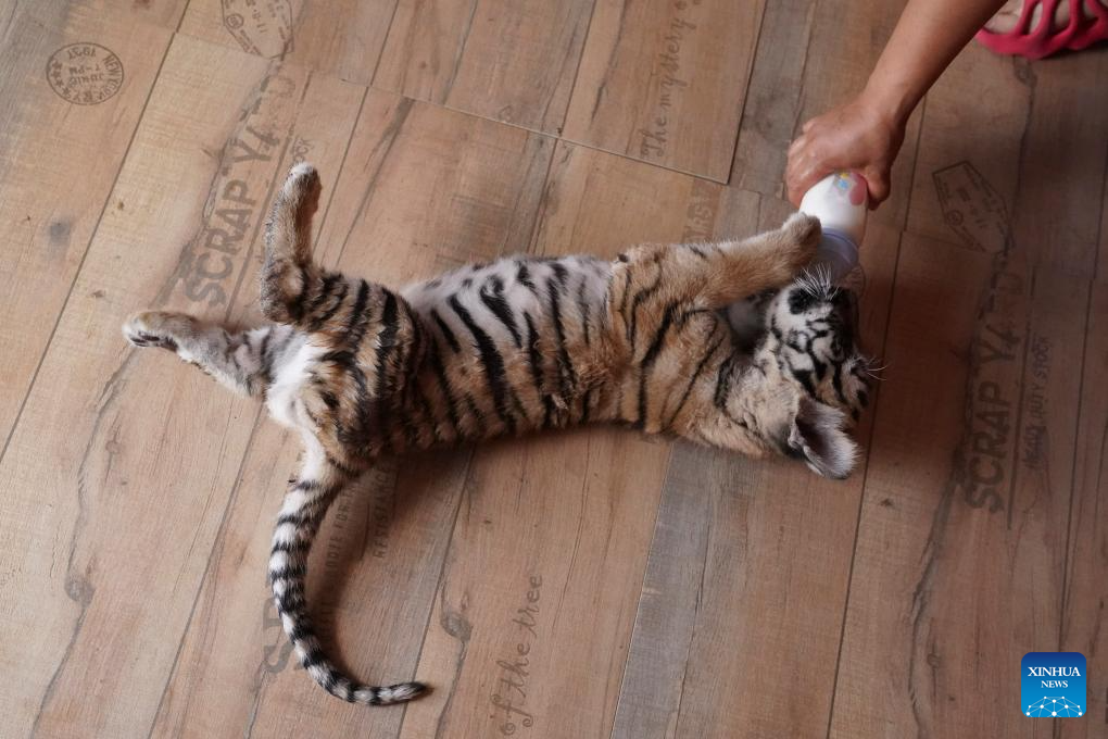 A keeper feeds milk to a Siberian tiger cub at Fuzhou Xian'gaishan wildlife zoo in east China's Jiangxi Province, July 25, 2024.?(Xinhua/Zhou Mi)