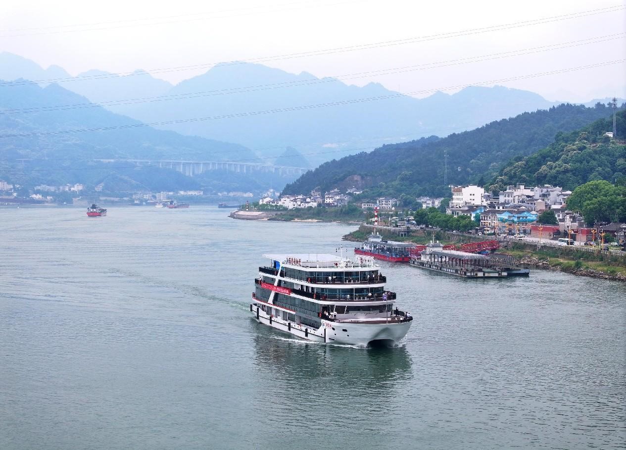 An intelligent new energy cruise ship equipped with an autopilot system sails on the waters of Sandouping, Yichang, central China's Hubei province, May 18. (People's Daily Online/Wang Gang)