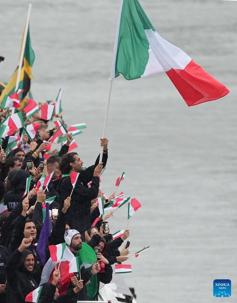 Members of the delegation of Italy are seen during the opening ceremony of the Paris 2024 Olympic Games in Paris, France, July 26, 2024. (Xinhua/Wan Xiang)