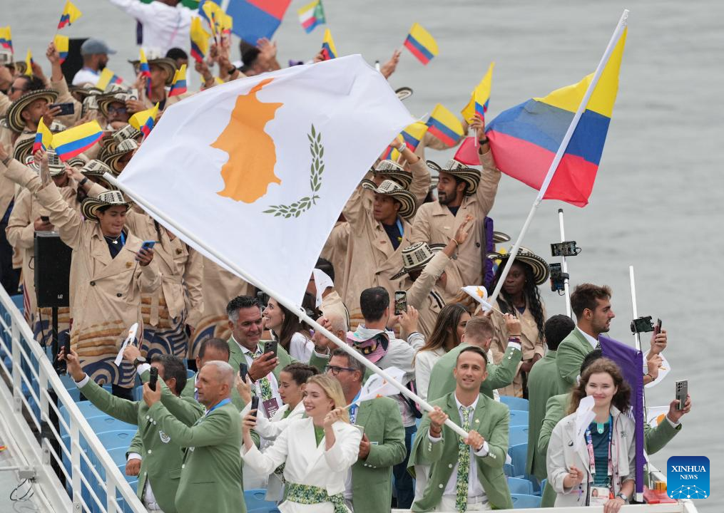 Members of the delegations of Cyprus and Colombia are seen during the opening ceremony of the Paris 2024 Olympic Games in Paris, France, July 26, 2024. (Xinhua/Wan Xiang)