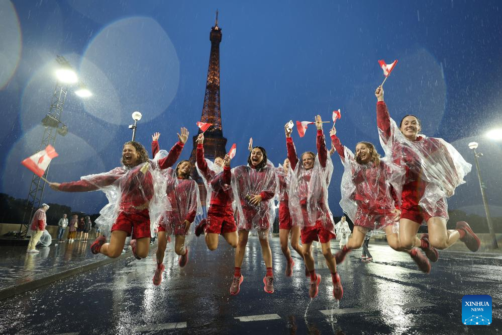 Members of the delegation of Canada are seen during the opening ceremony of the Paris 2024 Olympic Games in Paris, France, July 26, 2024, as the Eiffel Tower is seen in the background. (Xinhua/Li Ming)