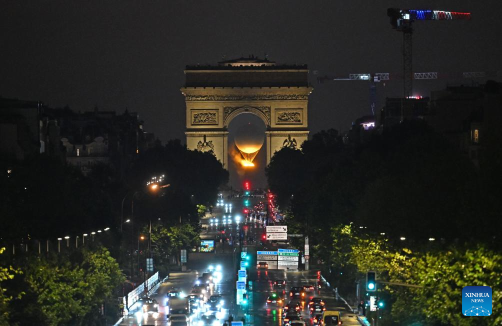 A balloon carrying the lit Olympic cauldron lifts off near Arc de Triomphe during the opening ceremony of the Paris 2024 Olympic Games in Paris, France, July 26, 2024. (Xinhua/Wu Lu)